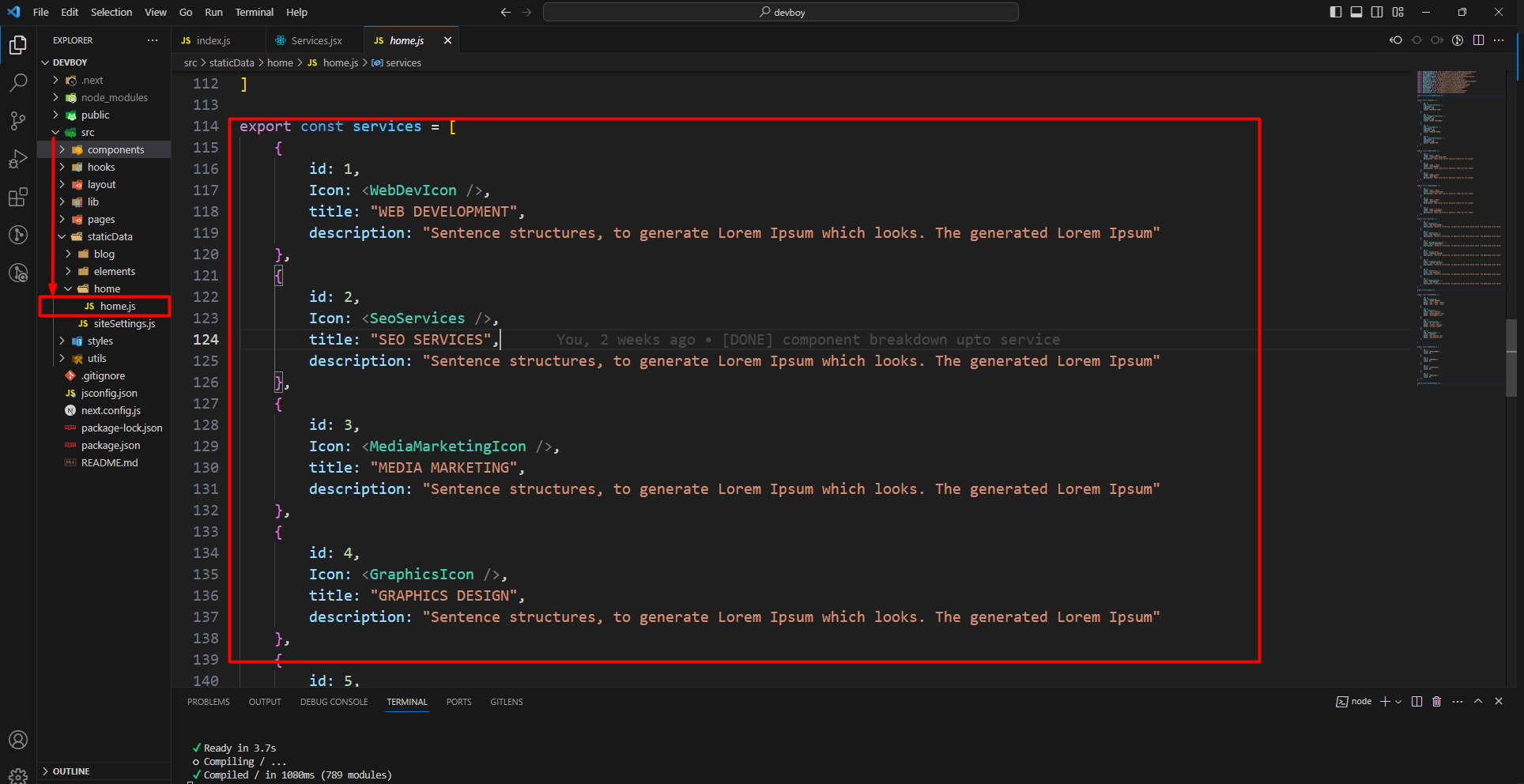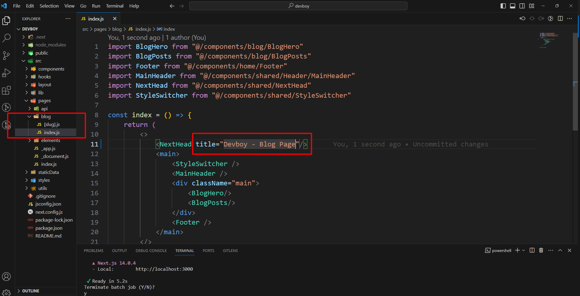 To change your specific page title and Favicon open the Devboy in your editor and go to the pages directory and the specific page by following screenshot which are given bellow.