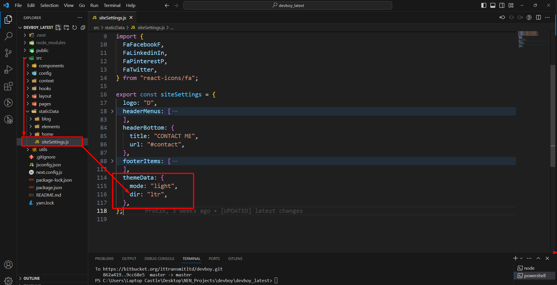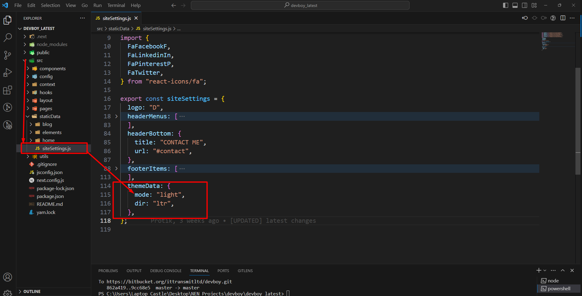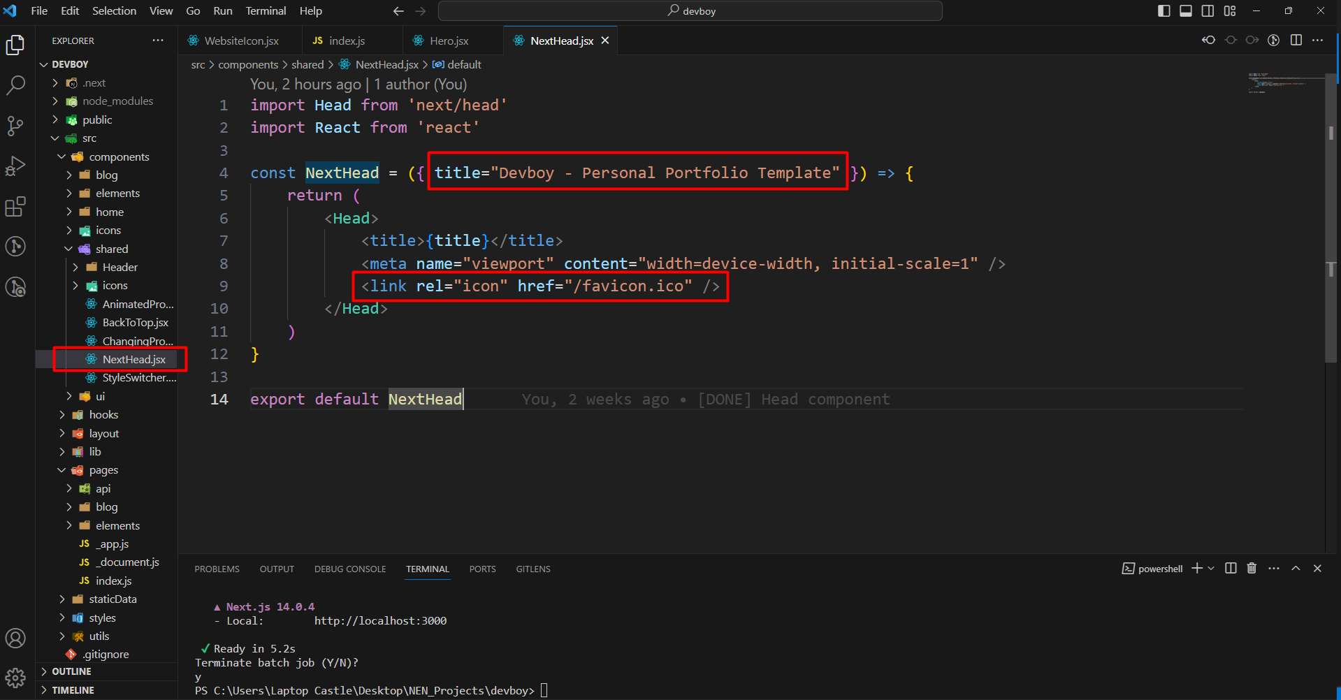 To change your Site title and Favicon open the Devboy in your editor and go to the location by following screenshot which are given bellow.