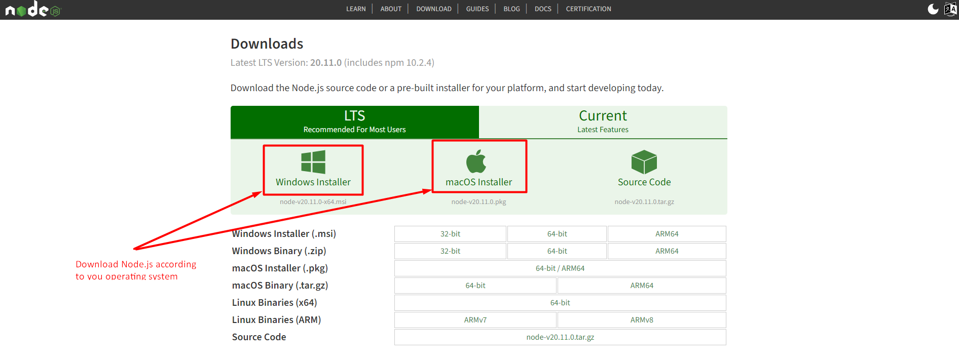 - Make sure to have Node.js installed & running on your computer. If you already have installed Node on your computer, you can skip this step if your existing node version is greater than 18. We suggest you to use LTS version of Node.js.
